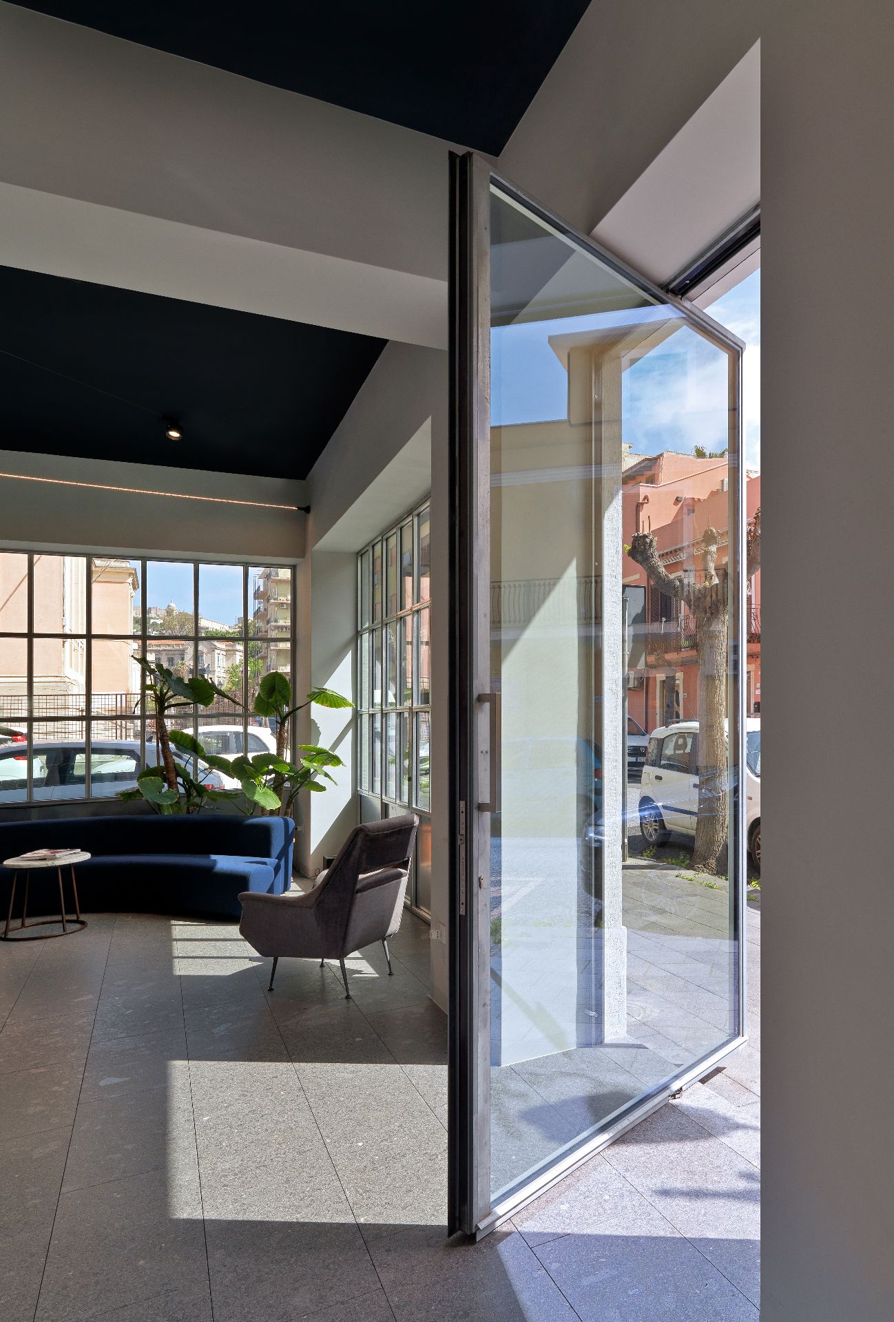 - Pivot-Tür mit verdecktem vertikalem Drehmechanismus und „Zero-Level“-Schwelle